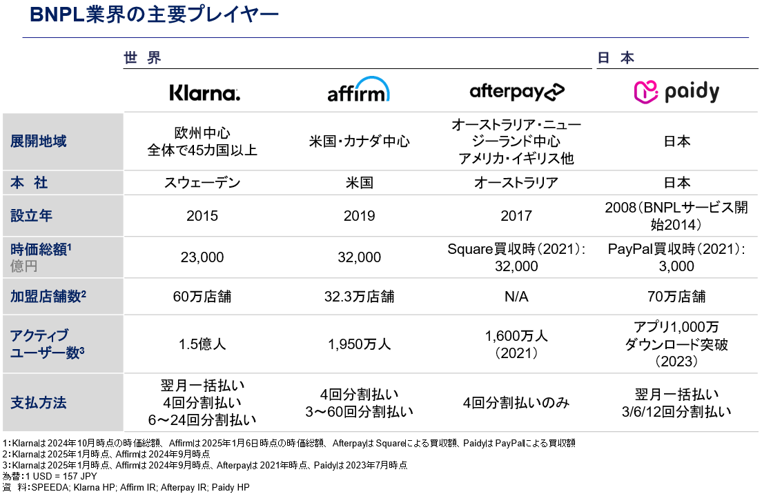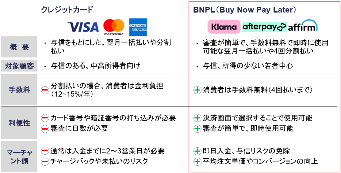 Klarnaが提供しているBNPLは、クレジットカードを持てない若者を主な対象顧客としており、手数料無料の一括払いや分割払いを提供しています。高金利なクレジットカードの分割払いに比べて、審査の簡便性や手数料等が無料であるといった点で消費者フレンドリーであり、「クレジットカードを持てない/持ちたくない」という若者から支持を得てきました。