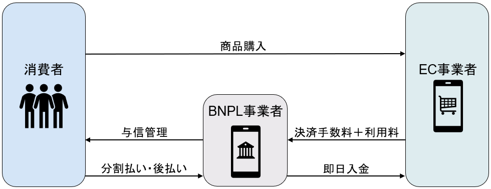 BNPLは、ユーザー側に対して無利子・手数料ゼロで後払いサービスを提供し、マーチャント側から月額利用料と決済金額に応じた手数料を受け取るビジネスモデルです。マネタイズする方法はクレジットカードと同じですが、手数料が低く、購買費用が即日入金であるという点でマーチャント側にもメリットがあります。加えて、リスクが伴わない分割払い/後払いオプションでユーザー側に対して購入を後押しし、カゴ落ち率を低下させる効果もあり、このことがマーチャントの売上増加に繋がるポイントであり、彼らがBNPLを導入する大きな理由です。