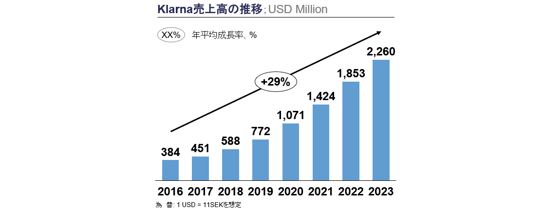 Klarnaは、2024年時点で1.5億人のアクティブユーザーを誇り、45ヵ国で60万以上の加盟店と提携しています。2023年の年間売上高は$2,260M、2024年3Q終了時点の年間売上高は$1,847M(前年同期比+23%)、粗利益は$882M(前年同期比+16%)を記録しています。一方で、事業全体としてはまだ赤字であり、AIの活用による人件費の削減や米国市場の開拓を通じて黒字転換を狙います。