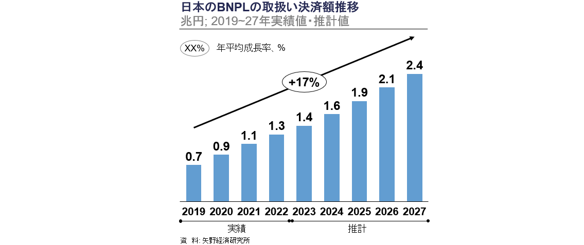 最後に日本のBNPL市場についてご説明します。日本のBNPL市場も順調に拡大しており、2017~2022年で0.4兆円から1.3兆円までCAGR 24%で成長しました。2027年には、2.4兆円規模へ成長すると予想されており、Paidyや弊社が出資するSmartpayなど、スタートアップが業界を牽引しています。