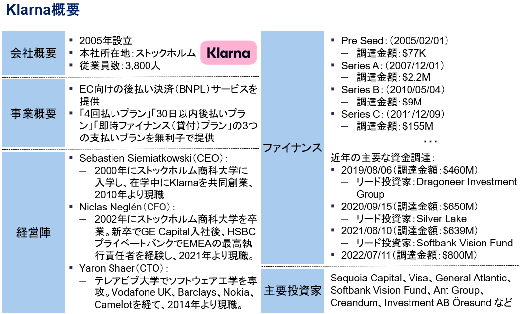 Klarnaは、2005年にスウェーデンのストックホルムで設立されたEC向けの後払い決済(BNPL)サービスを提供する会社です。2024年までに合計34回の資金調達を行っており、合計調達金額は$4.6B、評価額は$14.6Bに及びます。また、2024年11月に米国市場への上場申請を発表し、上場時の時価総額は$15~20Bになると予想されており、FinTechを代表するベンチャー企業の1つです。