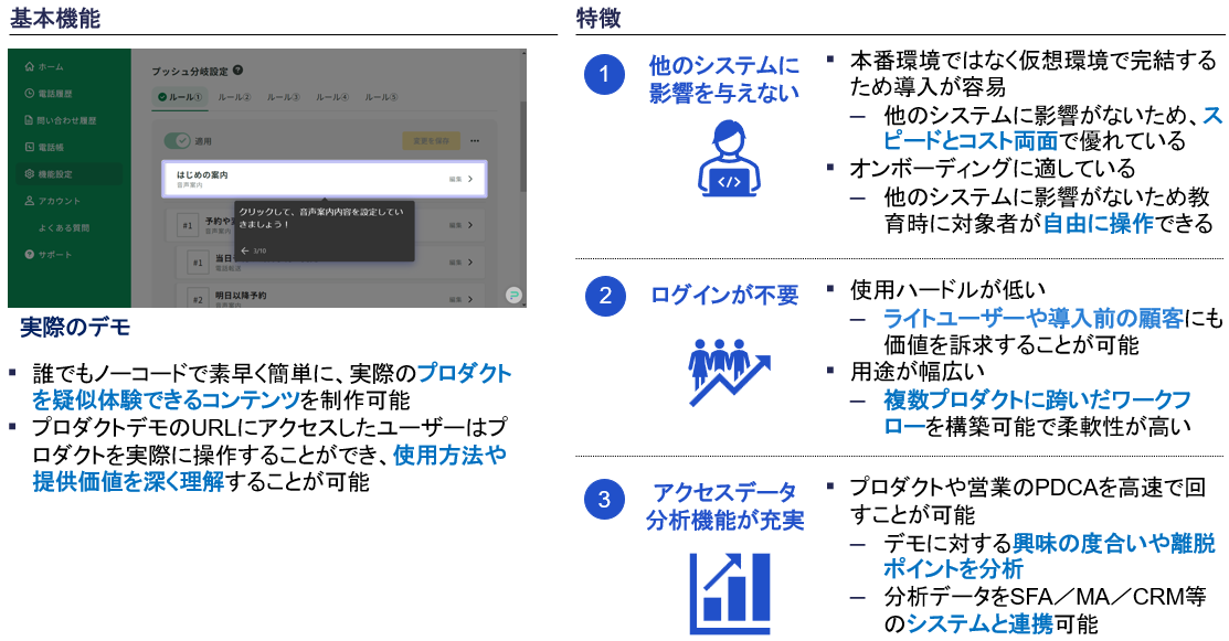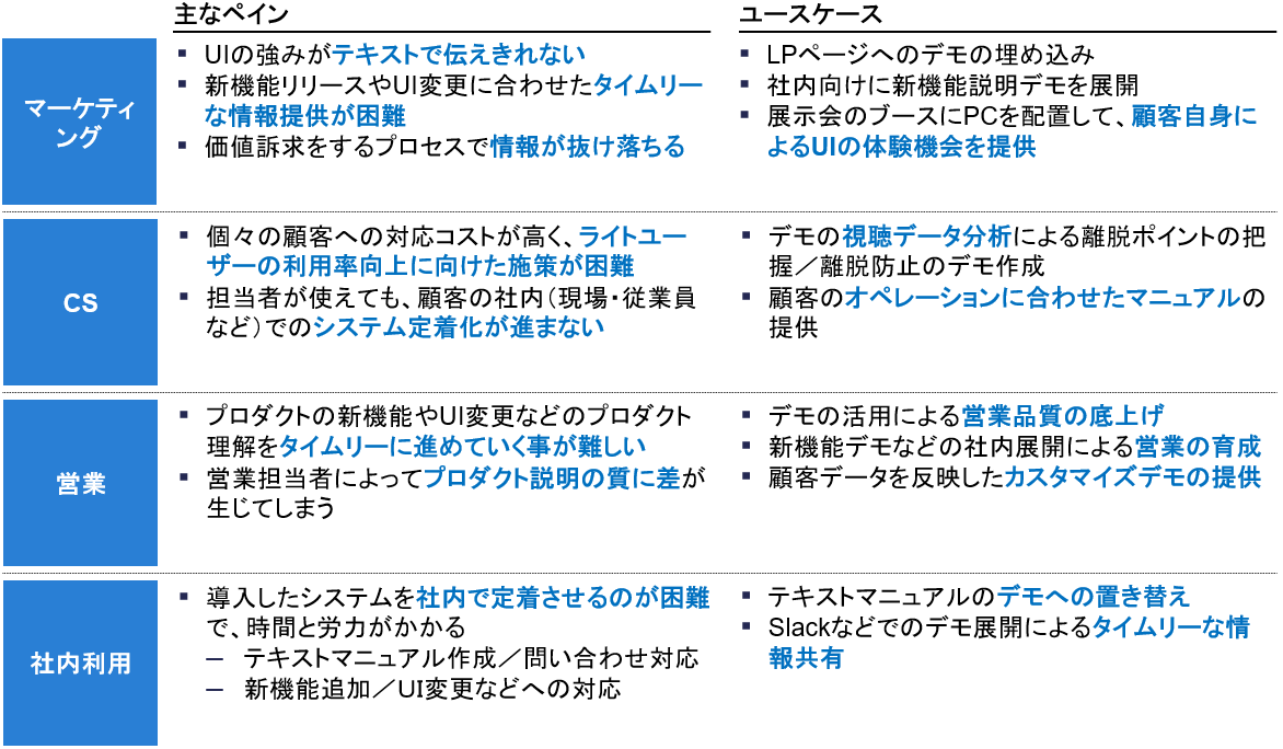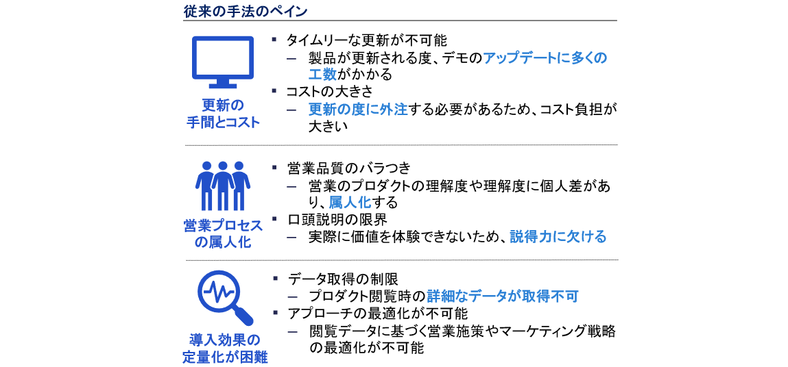 一方で、従来のプロダクトデモ手法には、プロダクト更新時の工数やコストの高さ、営業品質のバラつき、導入効果の定量化ができないなど、様々なペインが存在します。