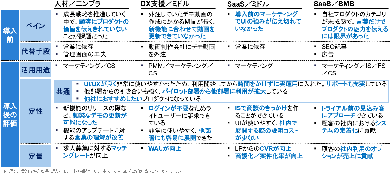 投資検討の際には、『PLAINER』を導入している企業へのインタビューも複数行いました。各企業は、プロダクトのマーケティングにおいて、「顧客にプロダクトの価値を伝えきれてない」「新機能に合わせてデモ動画を更新できていない」といった課題を抱えていました。このような課題に対して、『PLAINER』を利用することで頻繫なデモの更新が可能になり、定量的にWAU(Weekly Active User)やCVR(Conversion Rate)の向上も確認できました。 企業によっては、デモを活用したオンライン商談の成約率が大幅に改善されたケースもあり、実際の売上向上にも寄与する結果が得られています。