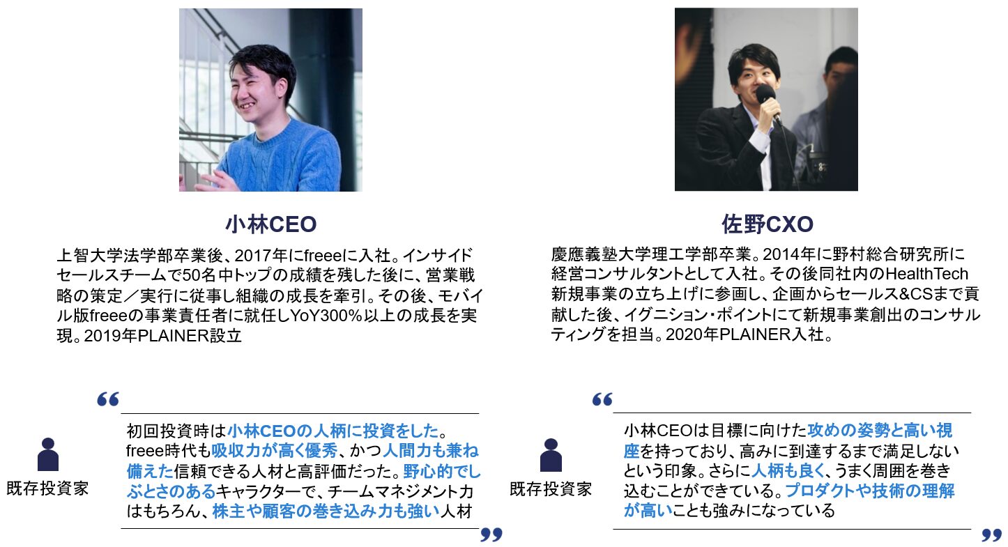 PLAINER社には、事業領域のペインを深く理解し、事業立ち上げ経験に富んだバランスの良い経営陣が集まっています。